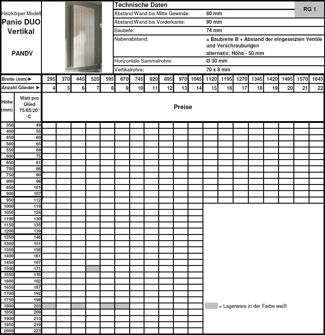 - das Modell Panio vertikal 1500 x 445/595 und 1800 x 285, 370, 445, 520, 595 und 670mm 1- lagig sowie 1500 x 520 und 1800 x 295, 445, 595 und 670mm 2-lagig