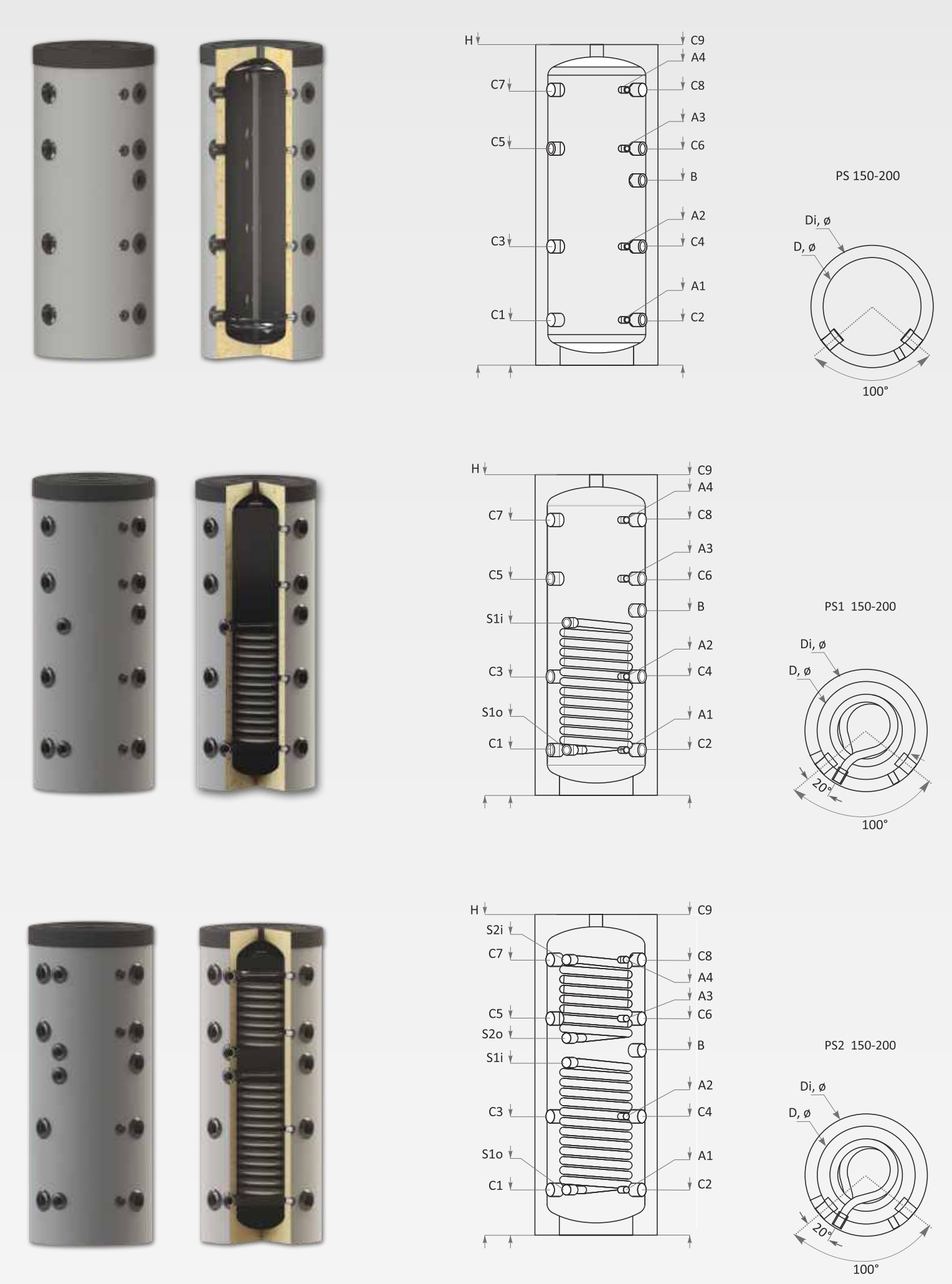 Die Pufferspeicher sind in Varianten mit einem oder 2 Glattrohr-Wärmetauschern zur indirekten Beiheizung durch externe Energiequellen wie Solarsysteme, Biomasse-Kessel, Wärmepumpe usw. erhältlich. Zwecks höherer Effizienz, sind alle Wärmetauscher mit großer Fläche entwickelt worden.