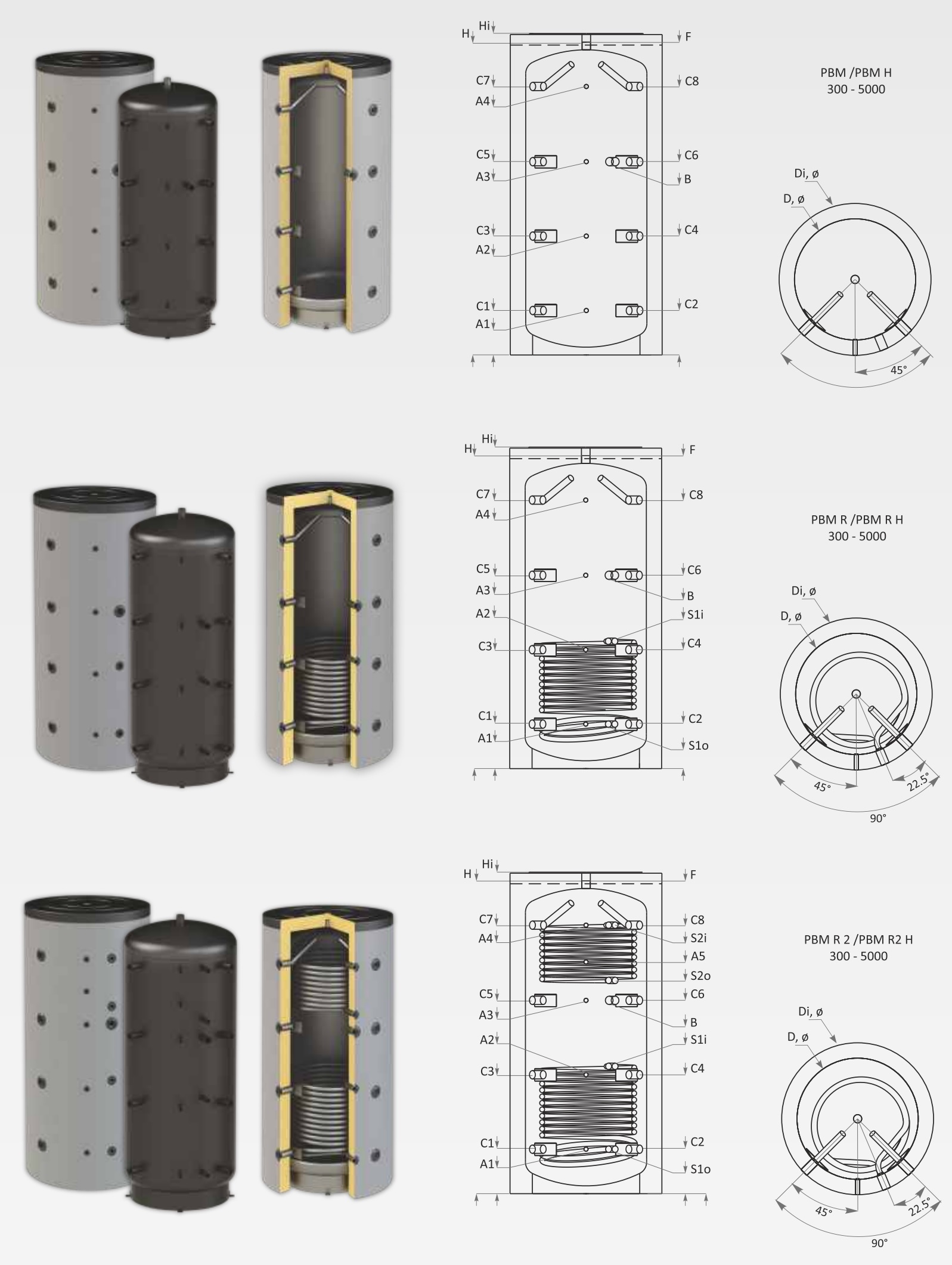 Die Pufferspeicher sind in Varianten mit einem oder 2 Glattrohr-Wärmetauschern zur indirekten Beiheizung durch externe Energiequellen wie Solarsysteme, Biomasse-Kessel, Wärmepumpe usw. erhältlich. Zwecks höherer Effizienz, sind alle Wärmetauscher mit großer Fläche entwickelt worden.