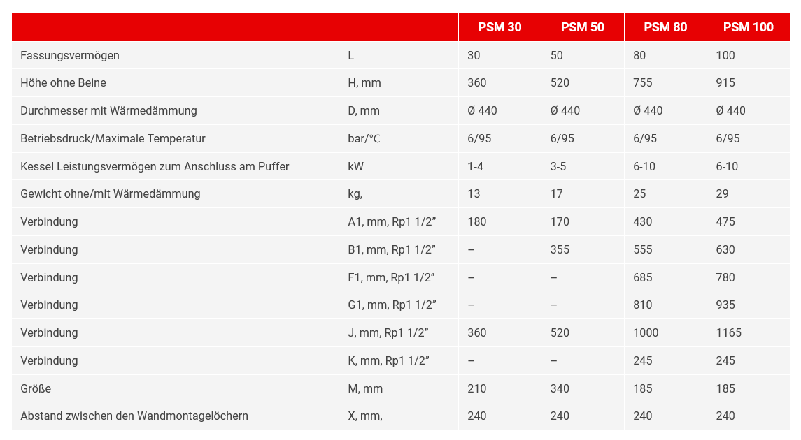 Speichers. Alle Pufferwasserspeicher mit einem Fassungsvernmögen bis 100l sind mit einer 100mm Wärmedämmung