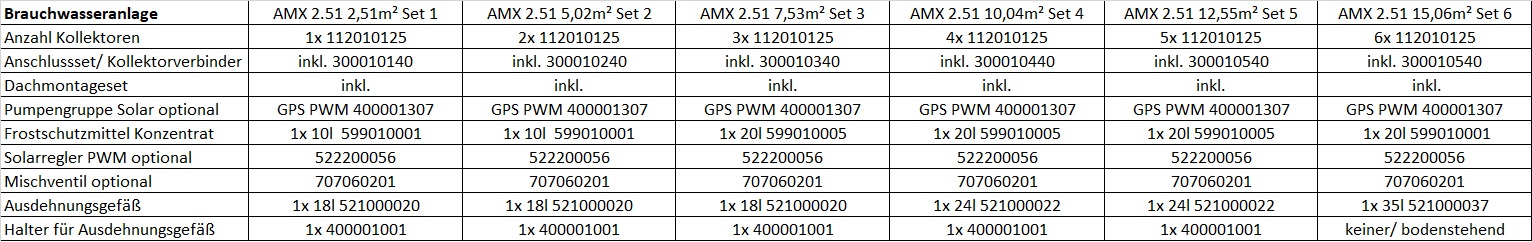 Das Solarkomplettpaket AMX2.51 besteht wahlweise aus 1-6 Flachkollektoren inkl. Zubehör. Alle Bauteile der AMX Solarpakete sind aufeinander abgestimmt und gewährleisten einen einwandfreien Betrieb. Im Lieferumfang der Solarpakete befinden sich alle zur Montage und Steuerung der Solaranlage notwendigen Zubehörteile wie Anschluss-Set, Regler, Dachmontagesets, Solarflüssigkeit, Entlüfter, Solarstation, Solar-Ausdehnungsgefäß, Brauchwassermischventil, Aufständerung für Flachdach (optional) und dem Solarrohr.