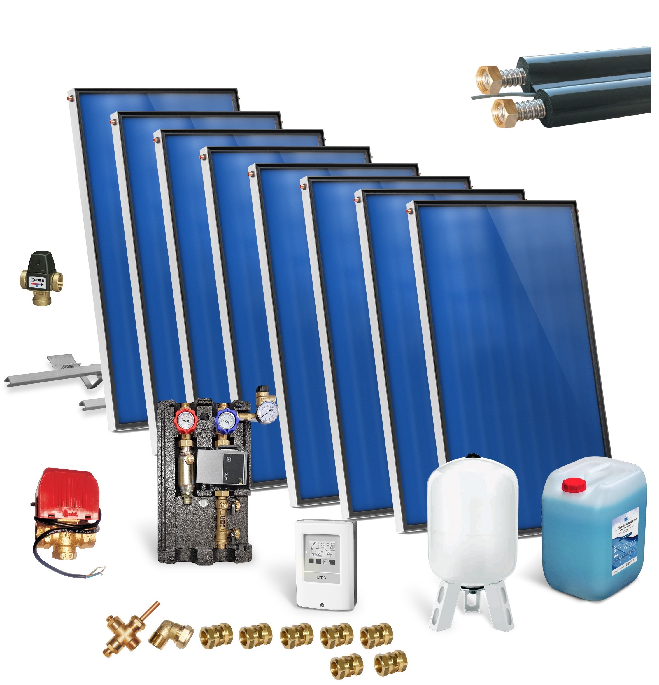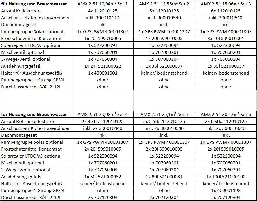 Das Solarkomplettpaket AMX2.51 besteht wahlweise aus 4-12 Flachollektoren inkl. Zubehör. Alle Bauteile der AMX Solarpakete sind aufeinander abgestimmt und gewährleisten einen einwandfreien Betrieb. Im Lieferumfang der Solarpakete befinden sich alle zur Montage und Steuerung der Solaranlage notwendigen Zubehörteile wie Anschluss-Set, Regler, Dachmontagesets, Solarflüssigkeit, Entlüfter, Solarstation, Solar-Ausdehnungsgefäß, 3-Wege-Ventil, Brauchwassermischventil, Aufständerung für Flachdach (optional), Hygienspeicher und dem Solarrohr.