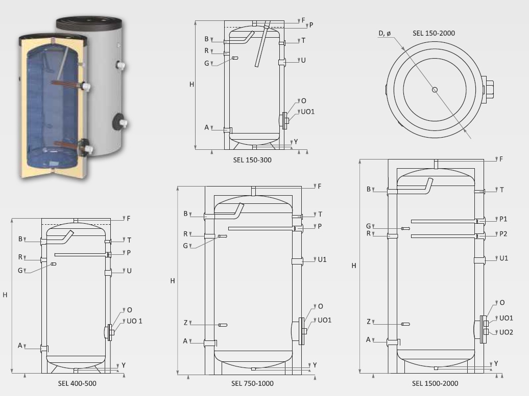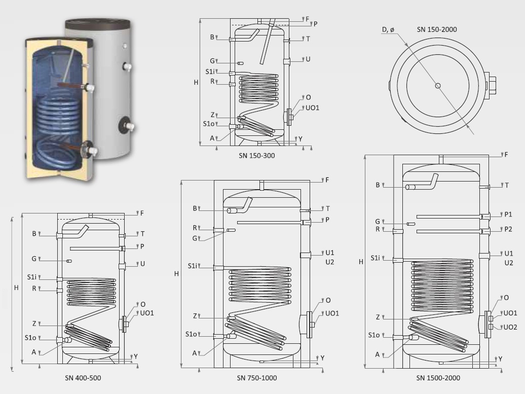 Die Trinkwasserspeicher sind in Varianten ohne, mit einem oder 2 Glattrohr-Wärmetauschern zur indirekten Beiheizung durch externe Energiequellen wie Solarsysteme, Biomasse-Kessel, Wärmepumpe usw. erhältlich. Zwecks höherer Effizienz, sind alle Wärmetauscher mit großer Fläche entwickelt worden.