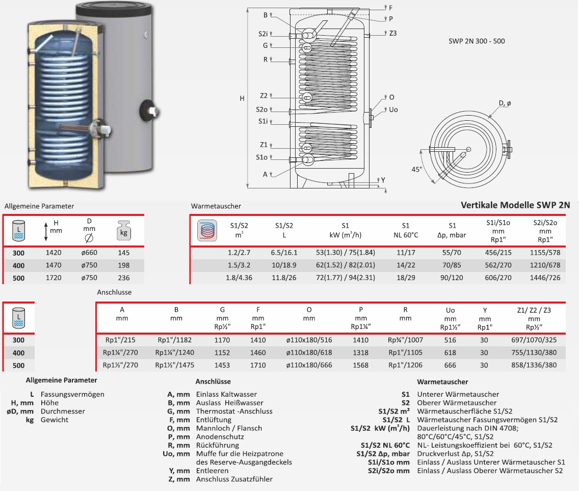 Die Trinkwasserspeicher sind in Varianten ohne, mit einem oder 2 Glattrohr-Wärmetauschern zur indirekten Beiheizung durch externe Energiequellen wie Solarsysteme, Biomasse-Kessel, Wärmepumpe usw. erhältlich. Zwecks höherer Effizienz, sind alle Wärmetauscher mit großer Fläche entwickelt worden.